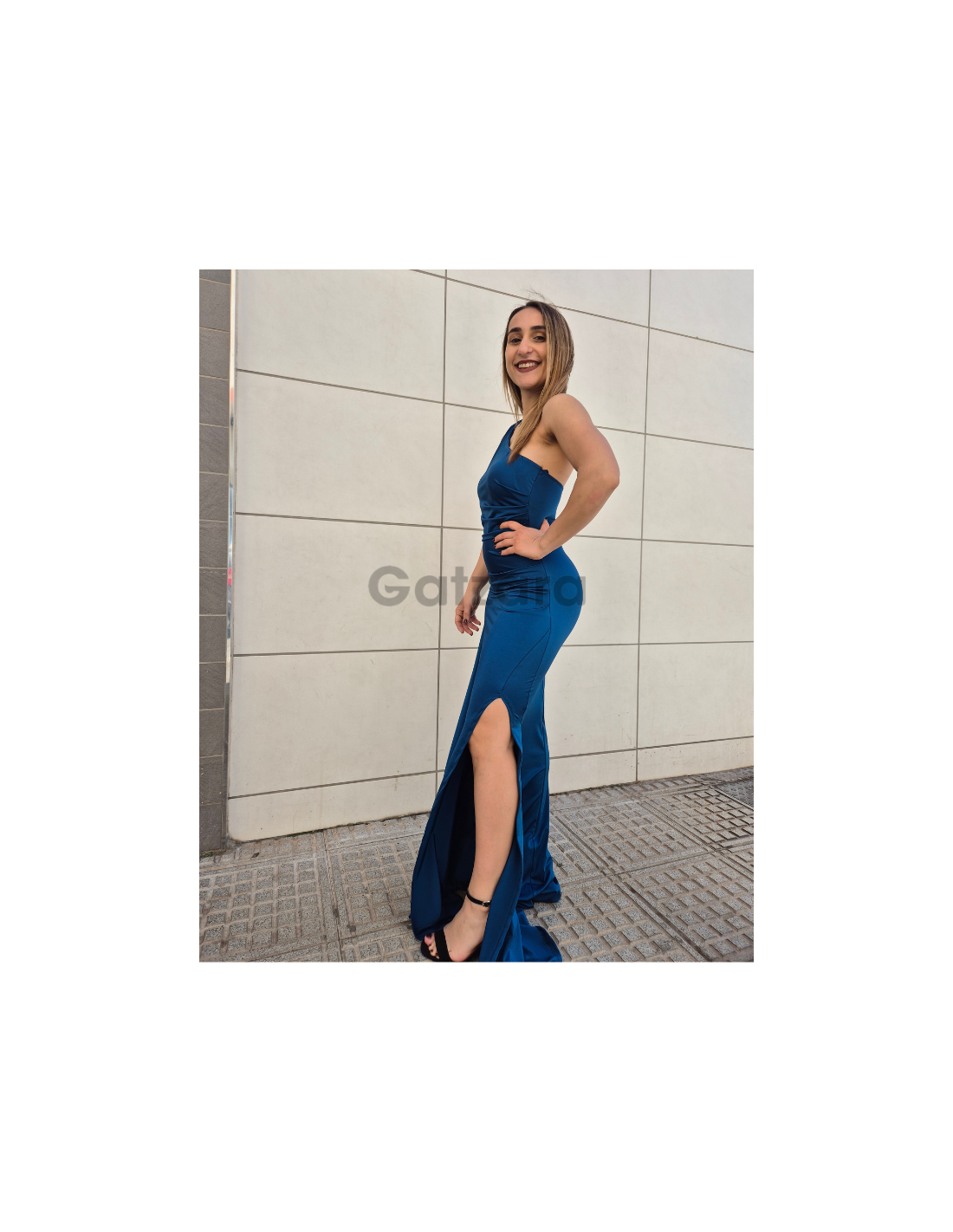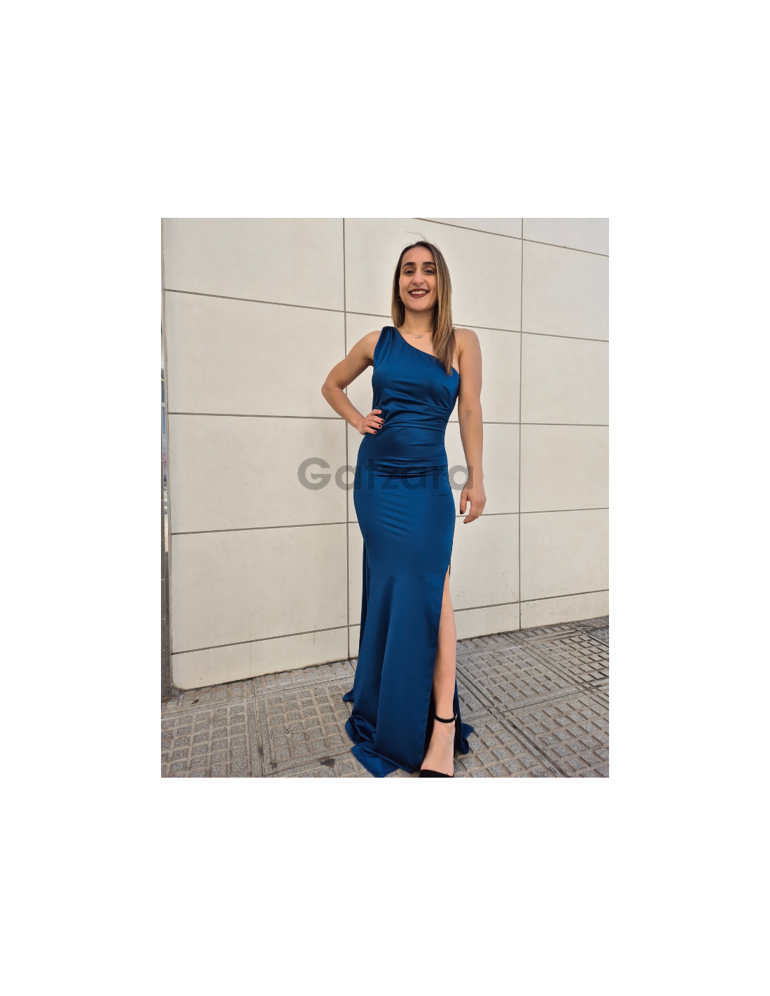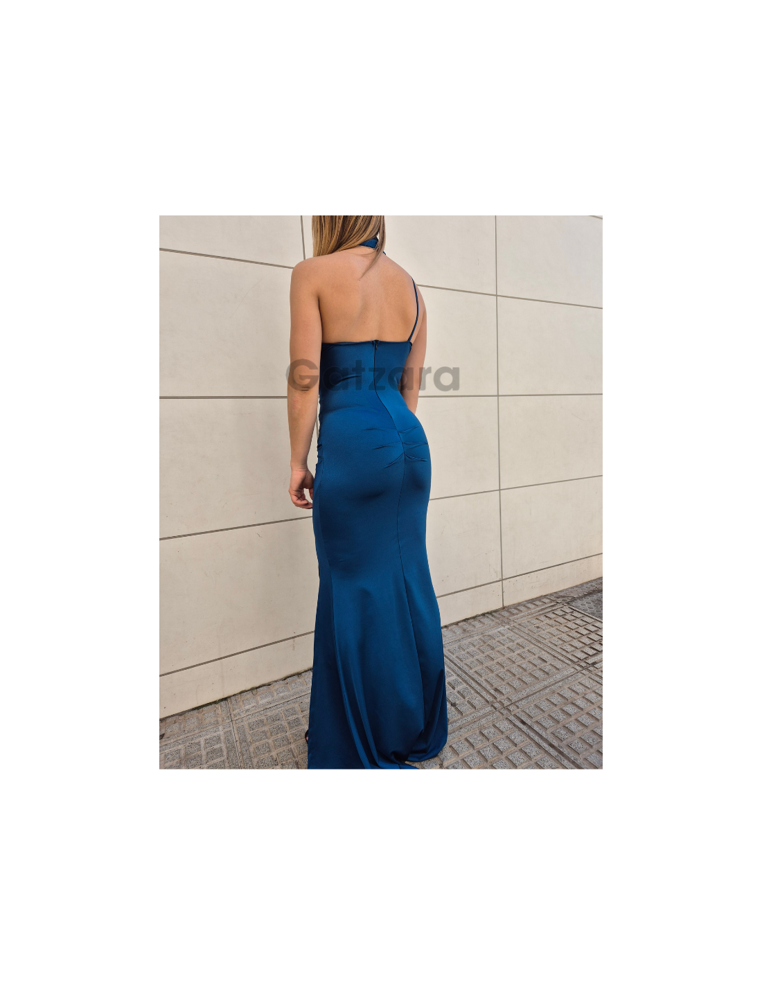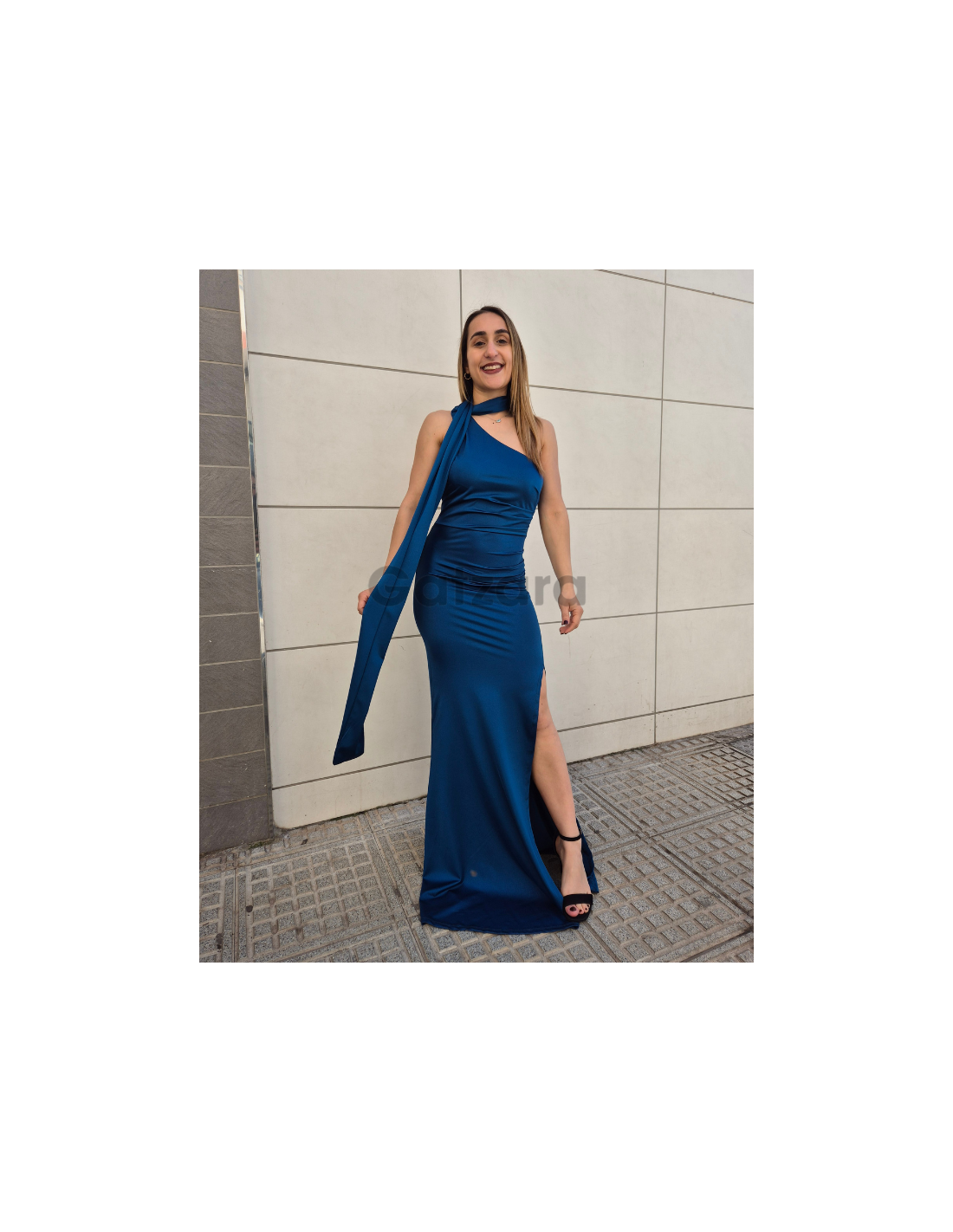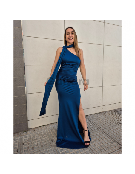Vestido largo asimétrico corte sirena. Foulard que sale del tirante. Copas internas. Cierre en la espalda con cremallera invisible.
