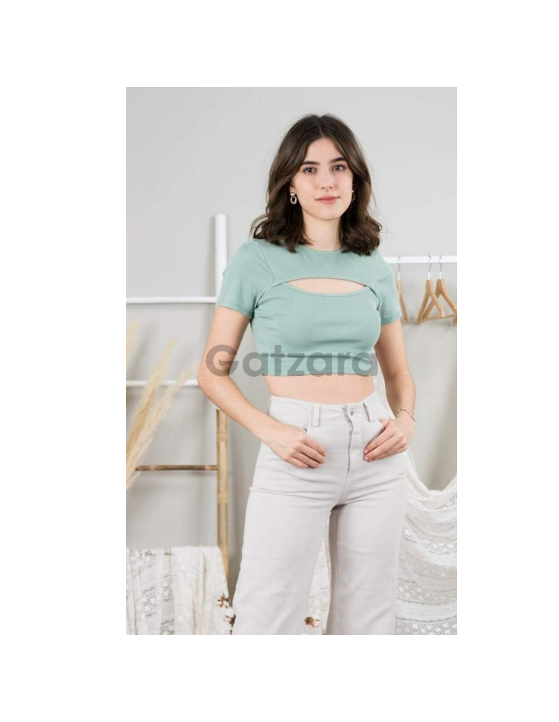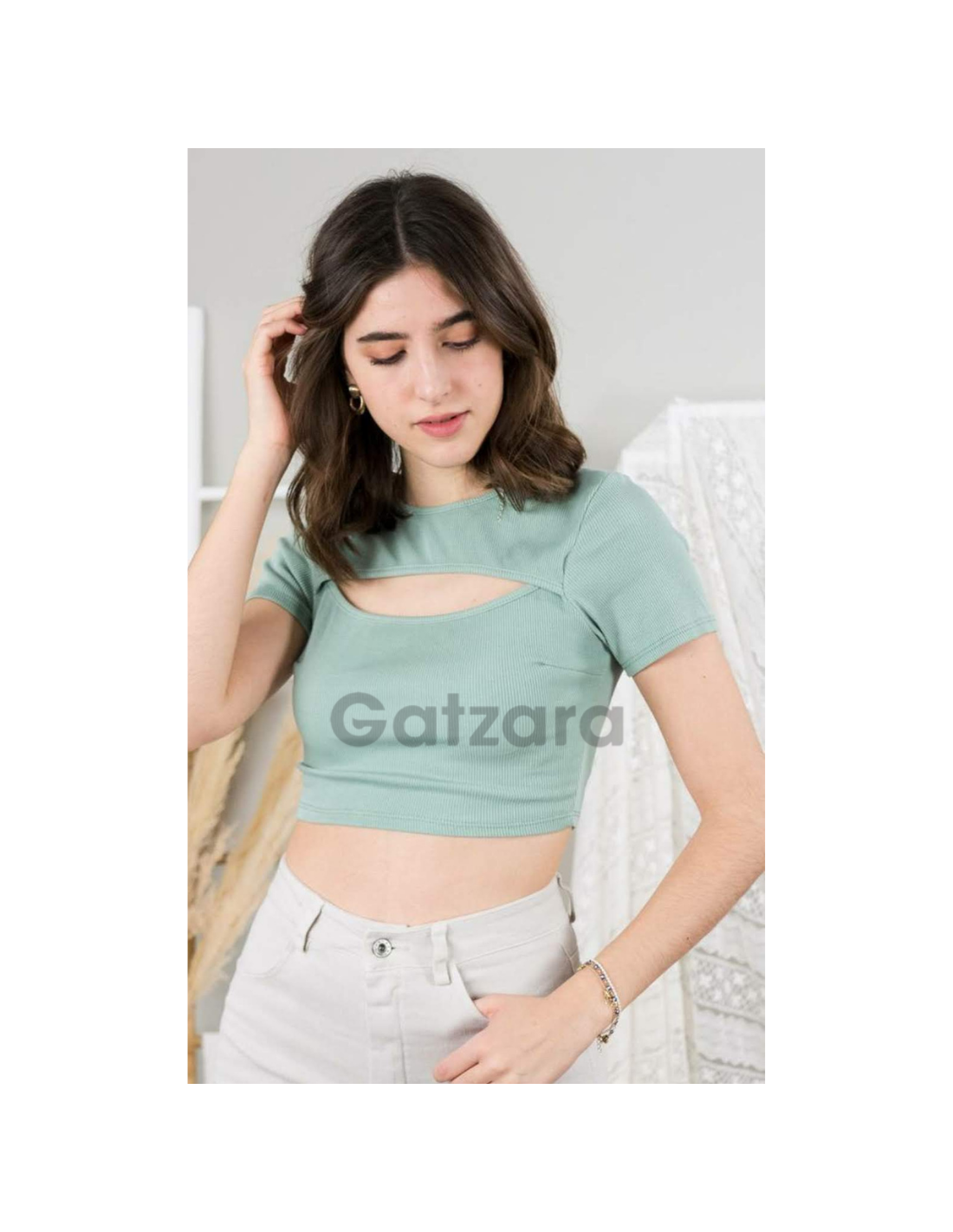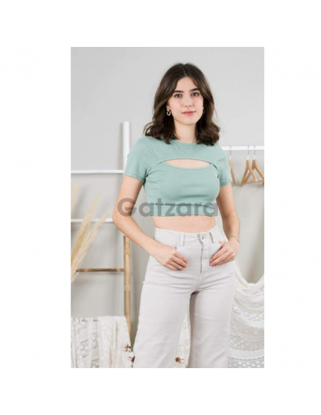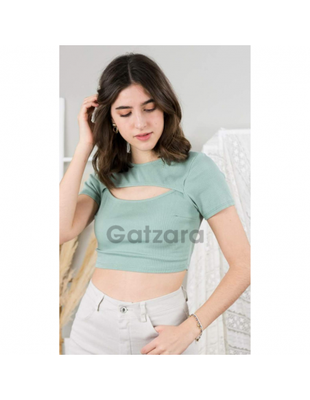 Camiseta tipo crop top de canalé manga corta con una abertura en el escote haciendo efecto dos piezas el cuello es redondo, su composición es de 95% algodón y un 5% elastano.