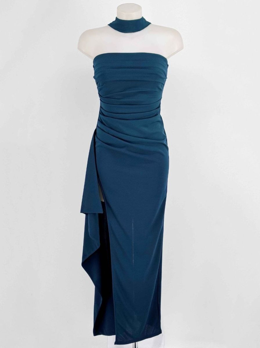 Vestido palabra de honor con abertura y cascada al lateral. Cierre con cremallera invisible en la espalda. Foular a juego.