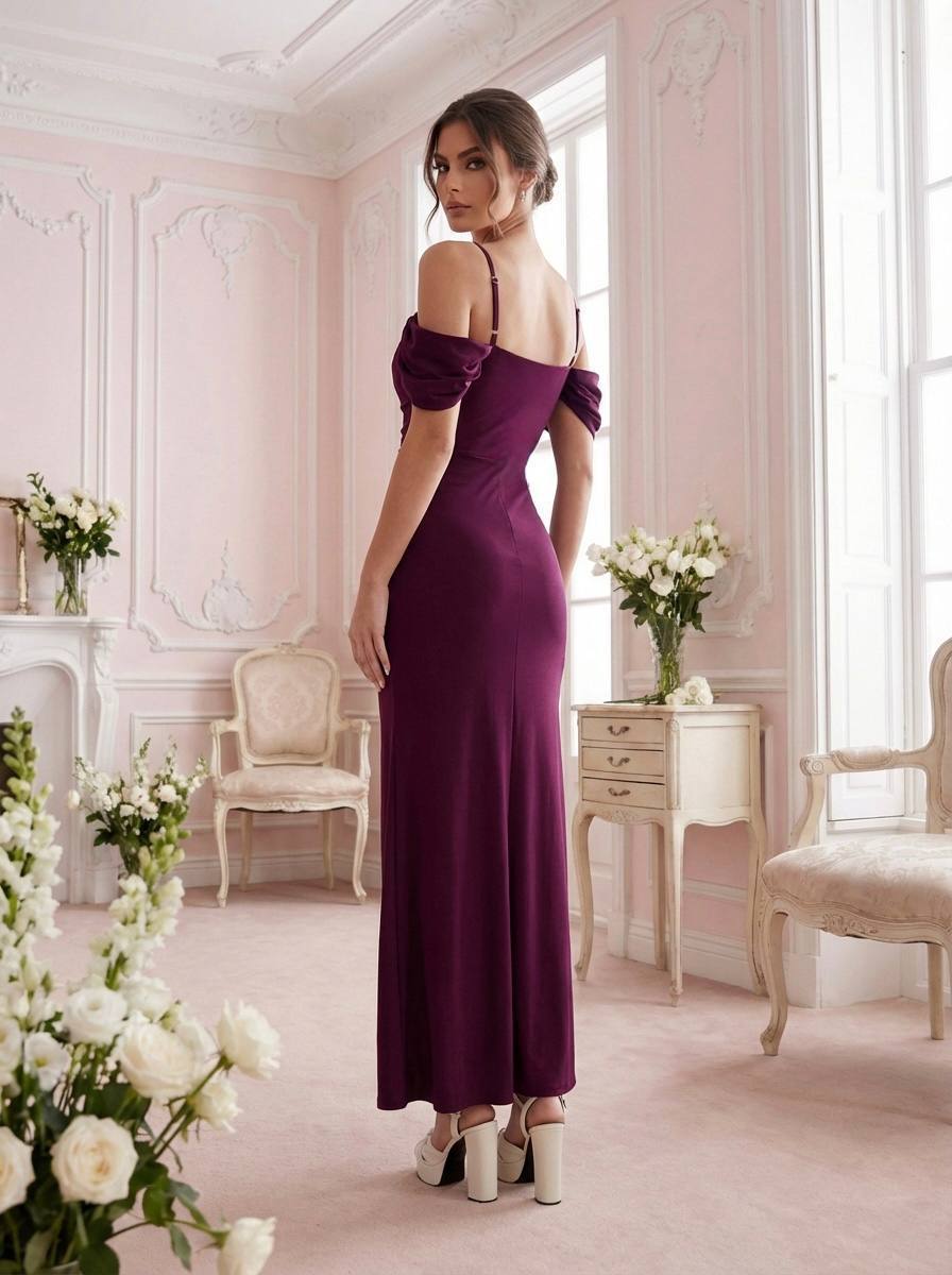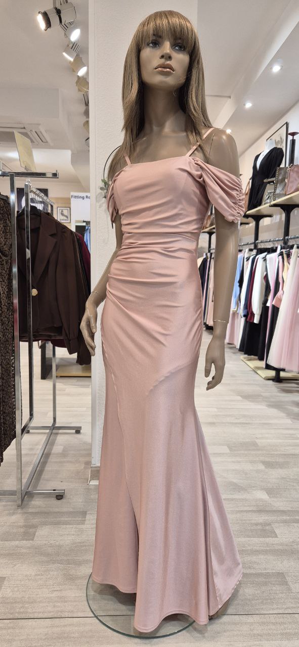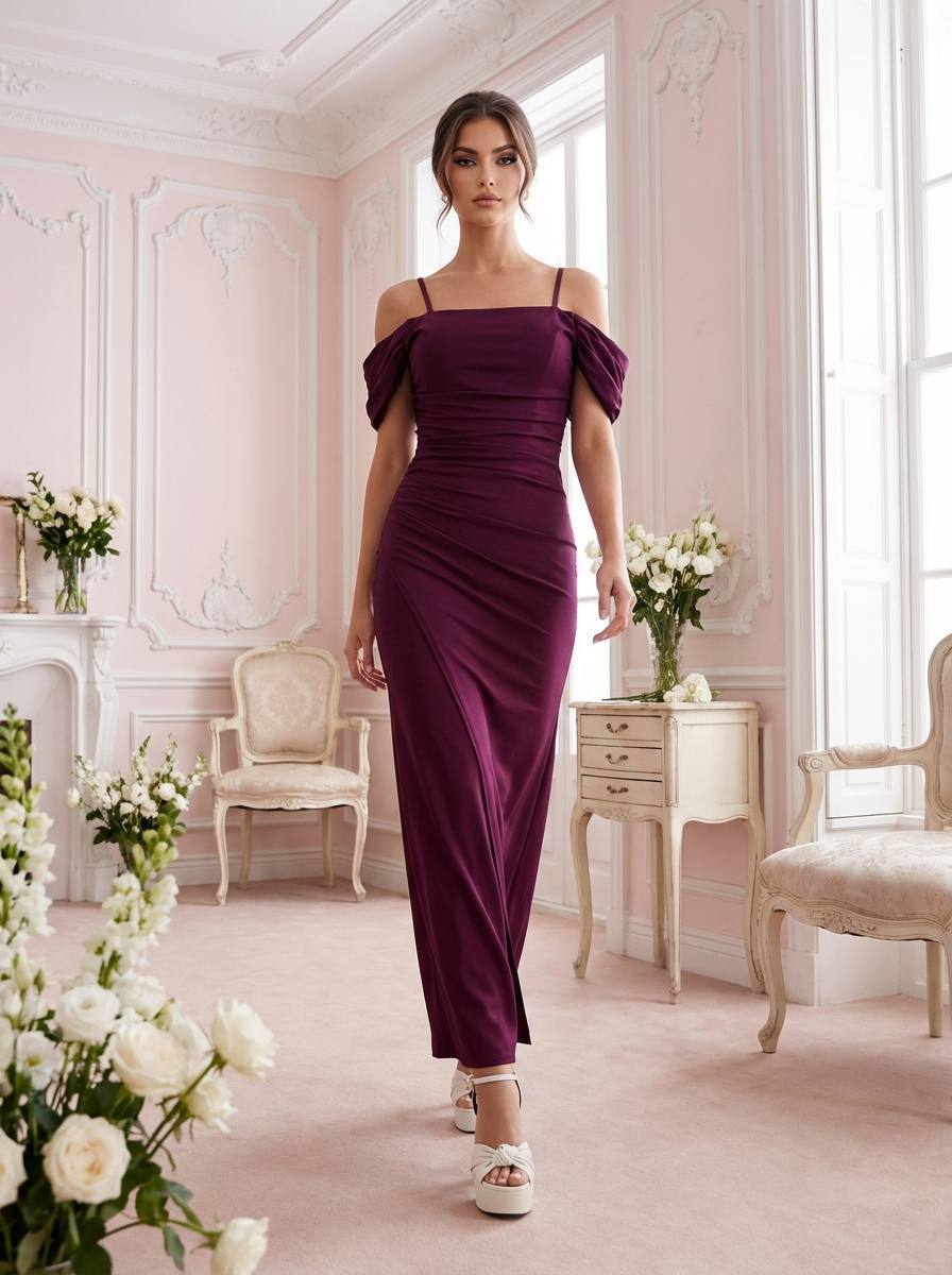 Vestido licra satinada,copas internas, tirante regulable y escote bardot.Falda drapeada con abertura.