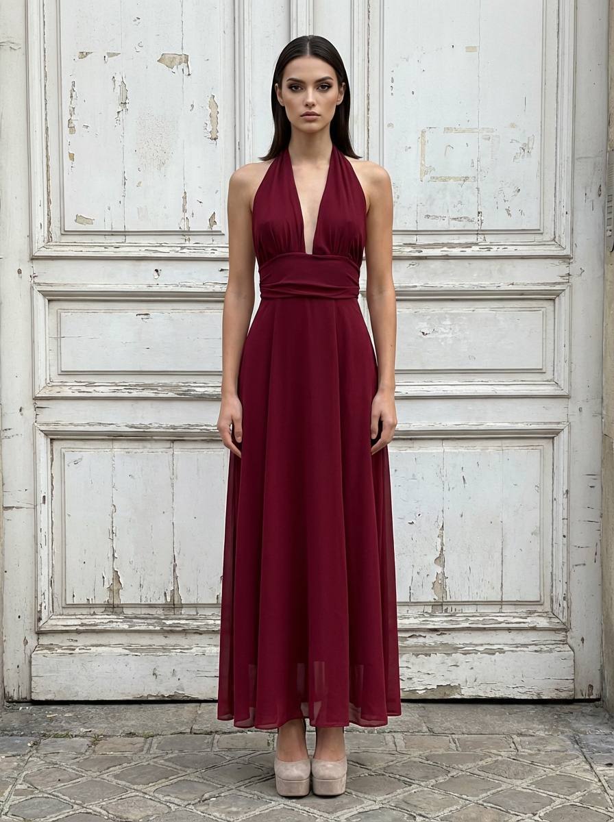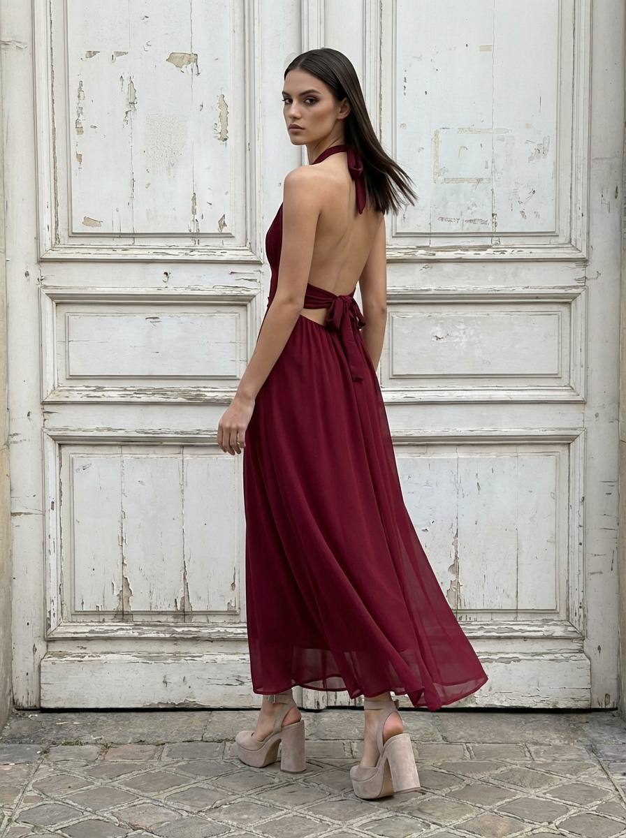 Vestido largo de gasa con forro al tono. Abertura en la falda y efecto fajín bajo el pecho. Se ata al cuello y a la espalda. Cinturilla trasera con elástico.