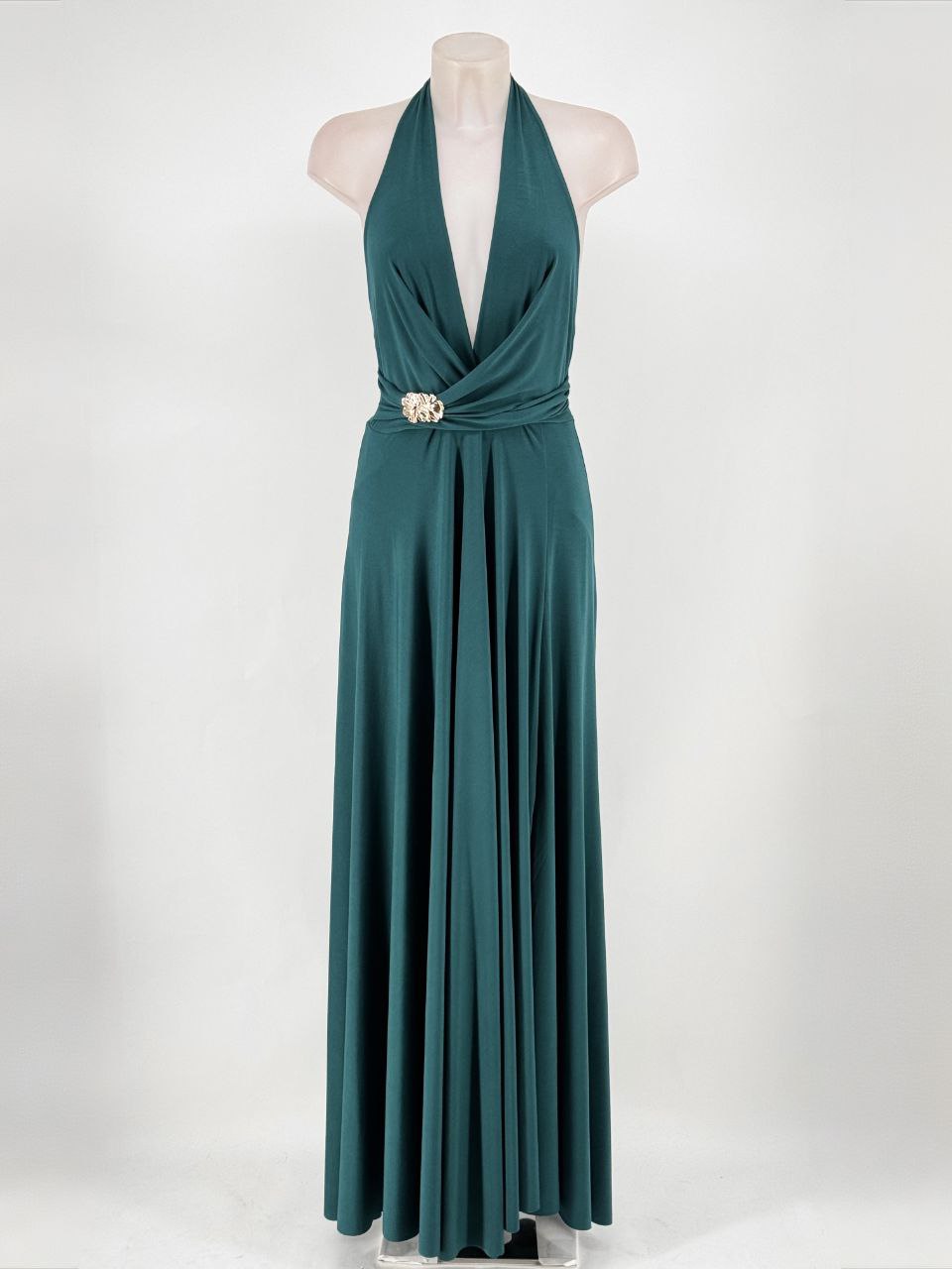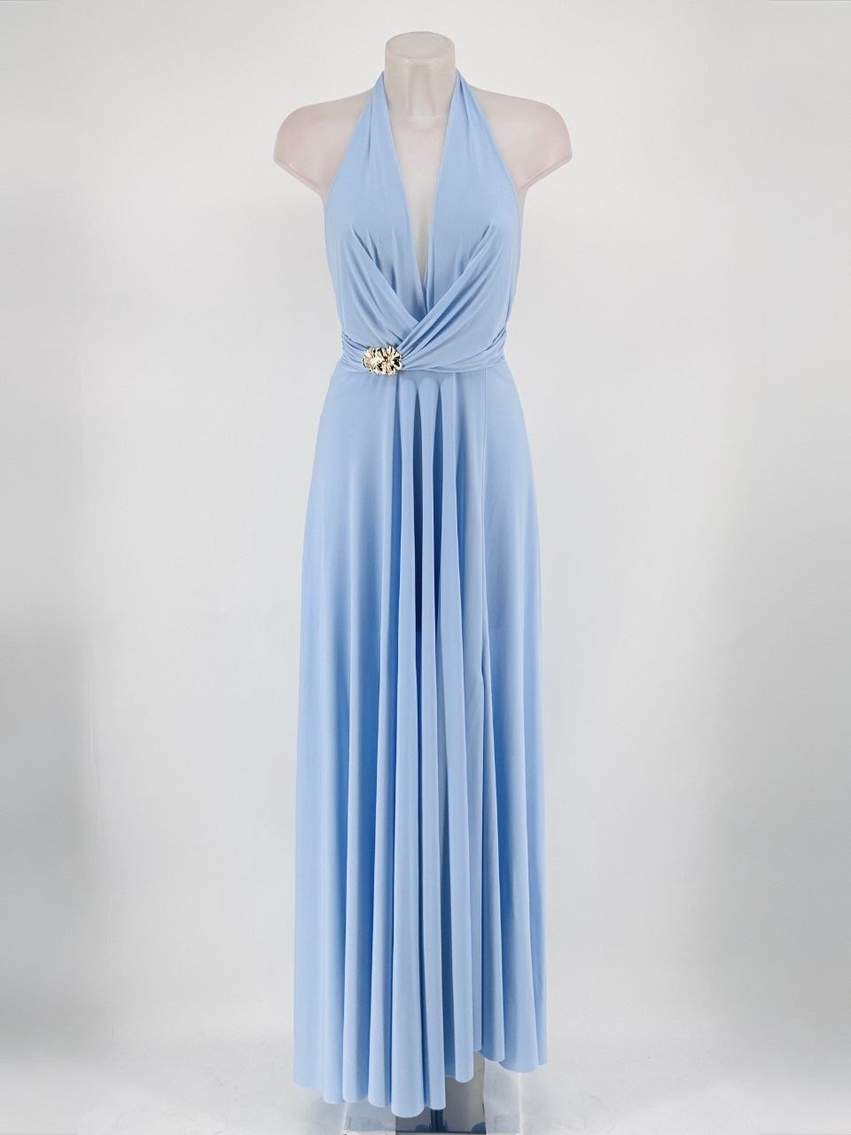 Vestido cuello halter y un broche en el escote, es con un Tejido fluido con una abertura latetral en la falda ideal para aportar movimiento.